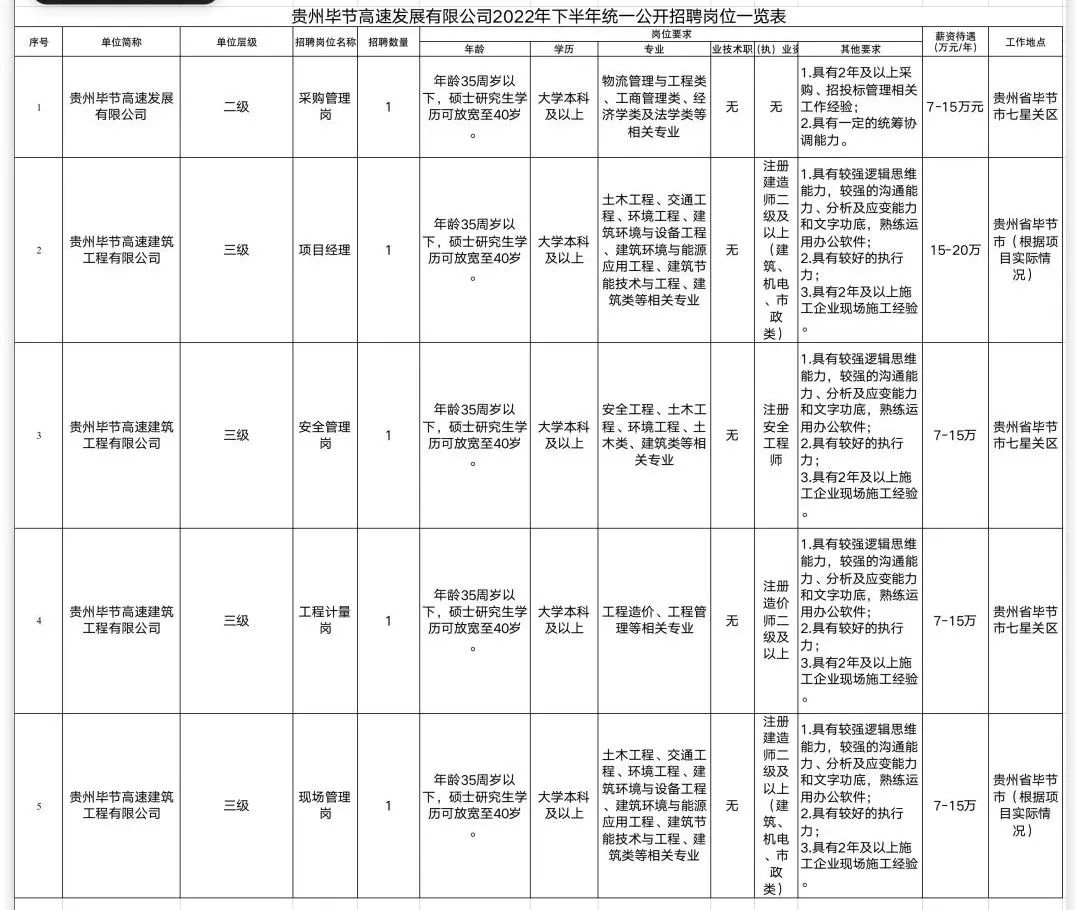 本次毕节高发公司及下属公司共计招聘5个岗位,5人。
