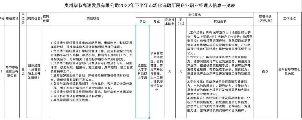 毕节市枢纽置业有限公司副总经理1名(分管资源土地开发管理)。