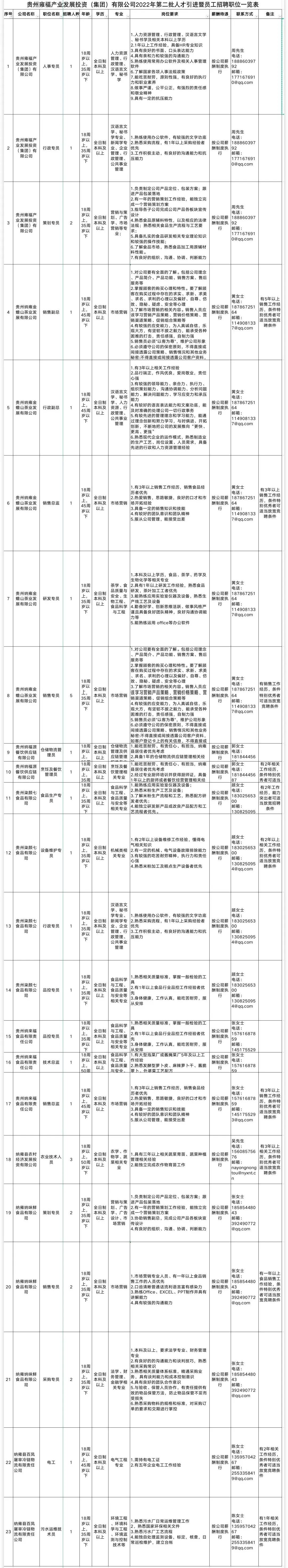 报名方式:采取发送电子邮件的方式报名,符合本次招聘的基本条件和岗位要求的应聘人员填写《贵州雍福产业发展投资(集团)有限公司2022年第二批人才引进暨员工招聘报名表》(附件2)和个人简历发送至对应公司联系人邮箱,报名表以“职位代码+姓名+报名表”命名(如:YF202210001+张三+报名表),个人简历以“职位代码+姓名+个人简历”命名(如:YF202210001+张三+个人简历)。