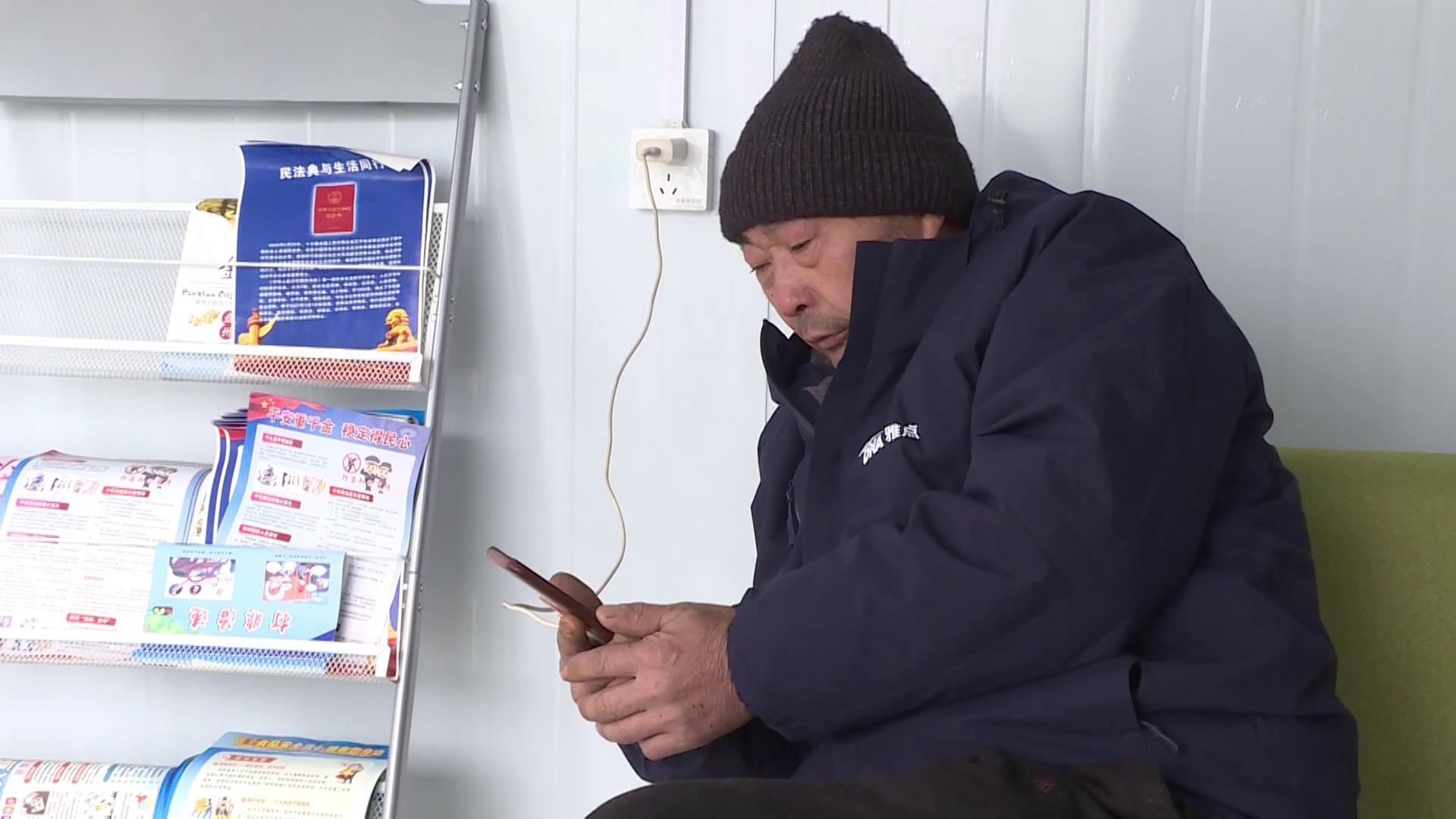 在盘务工的四川泸州人王军告诉记者,感觉便民服务亭这里面温暖,可以充电,还有姜汤喝,保保温,增加温度。
