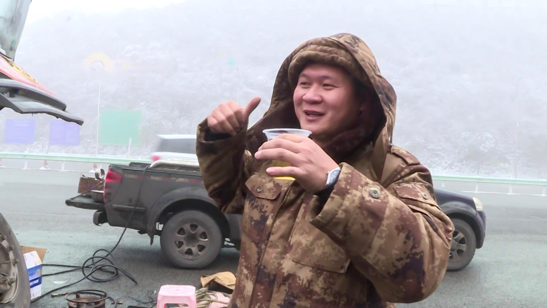 广西钦州胡泽禄开着货车送饲料到盘州市乌蒙镇,路上车子坏了,正在维修,在寒冷的天气得到盘兴高速志愿者的关怀让他感觉备受温暖。