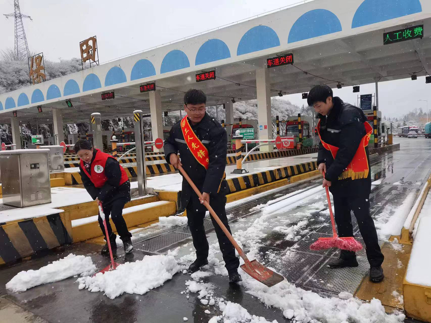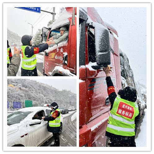 盘兴高速“一路三方”各部门党支部党员先锋队、盘兴高速服务标兵、青年突击队,发挥先锋模范作用,坚守一线岗位,及时妥善做好撒融雪剂、车辆分流等工作,全力保障恶劣天气时段辖区道路安全畅通。