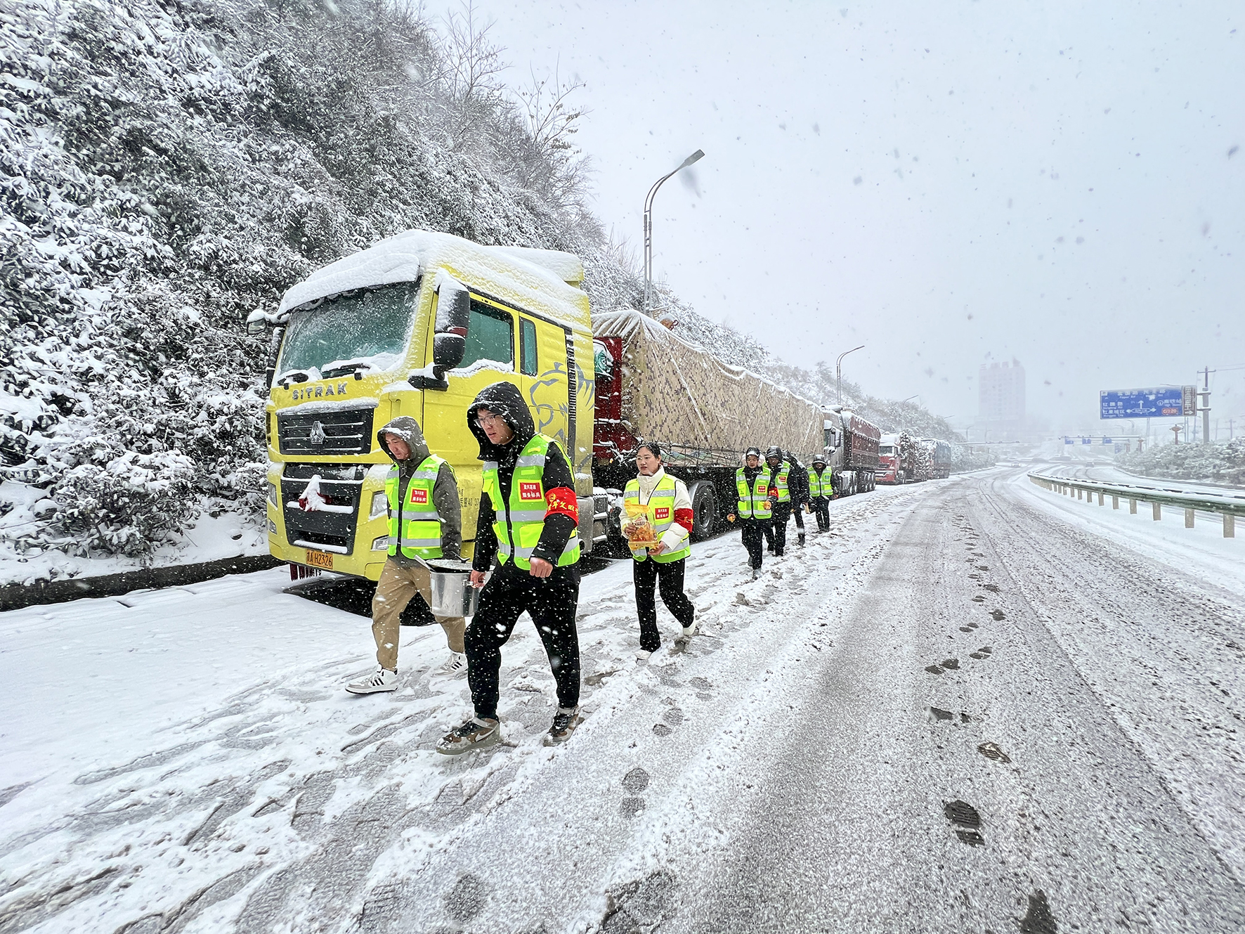 “喝杯茶。”“谢了,谢了。”“慢一点,注意安全。”因为交通临时管制,盘兴高速志愿者们为临时滞留在盘州东收费站的司乘人员准备了方便面、姜汤等暖心服务,一杯小小的姜汤,朴实的话语,“姜”温暖传递,暖至人心。