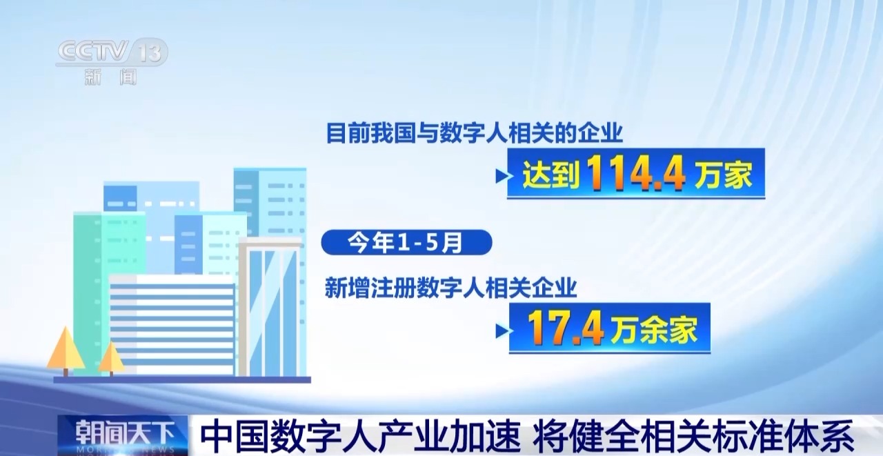 数据显示,目前我国与数字人相关的企业达到114.4万家。今年1至5月,新增注册数字人相关企业17.4万余家。从行业分布来看,文化、体育和娱乐业,信息传输、软件和信息技术服务业合计占比超6成。