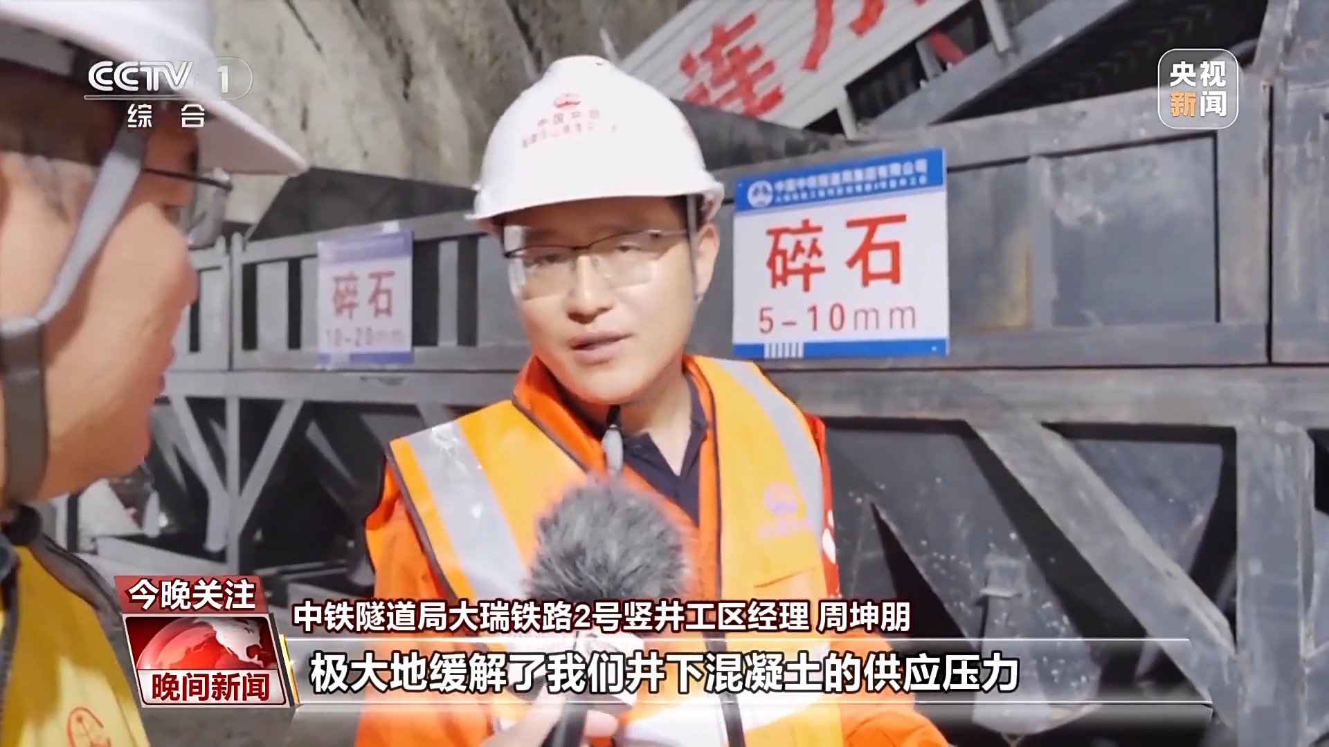 中铁隧道局大瑞铁路2号竖井工区经理 周坤朋:极大地缓解了我们井下混凝土的供应压力,时间上面从每小时下放混凝土9立方米,通过井下拌和站,可以达到每小时生产20到25立方米左右。