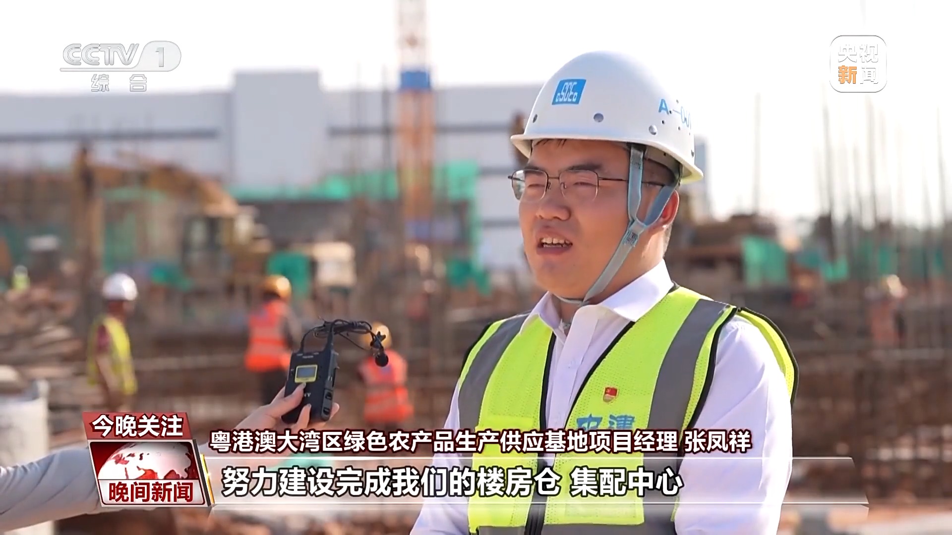 粤港澳大湾区绿色农产品生产供应基地项目经理 张凤祥:努力加快建设楼房仓、集配中心、面粉面条加工车间等各个区段,确保任务能够按时完成。