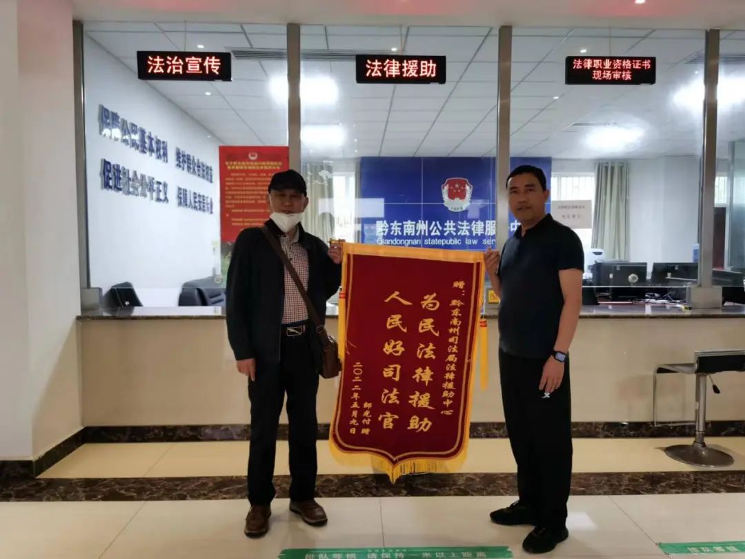 5月9日上午,黔东南州法律援助中心收到邹某某送来写有“为民法律援助,人民好司法官”字样的锦旗。邹某某紧握住州法律援助中心工作人员的手并激动地对说道:“非常感谢州法律援助中心和律师给予的热心帮助,如果没有你们,我就没有办法办成我的事情啊!”。