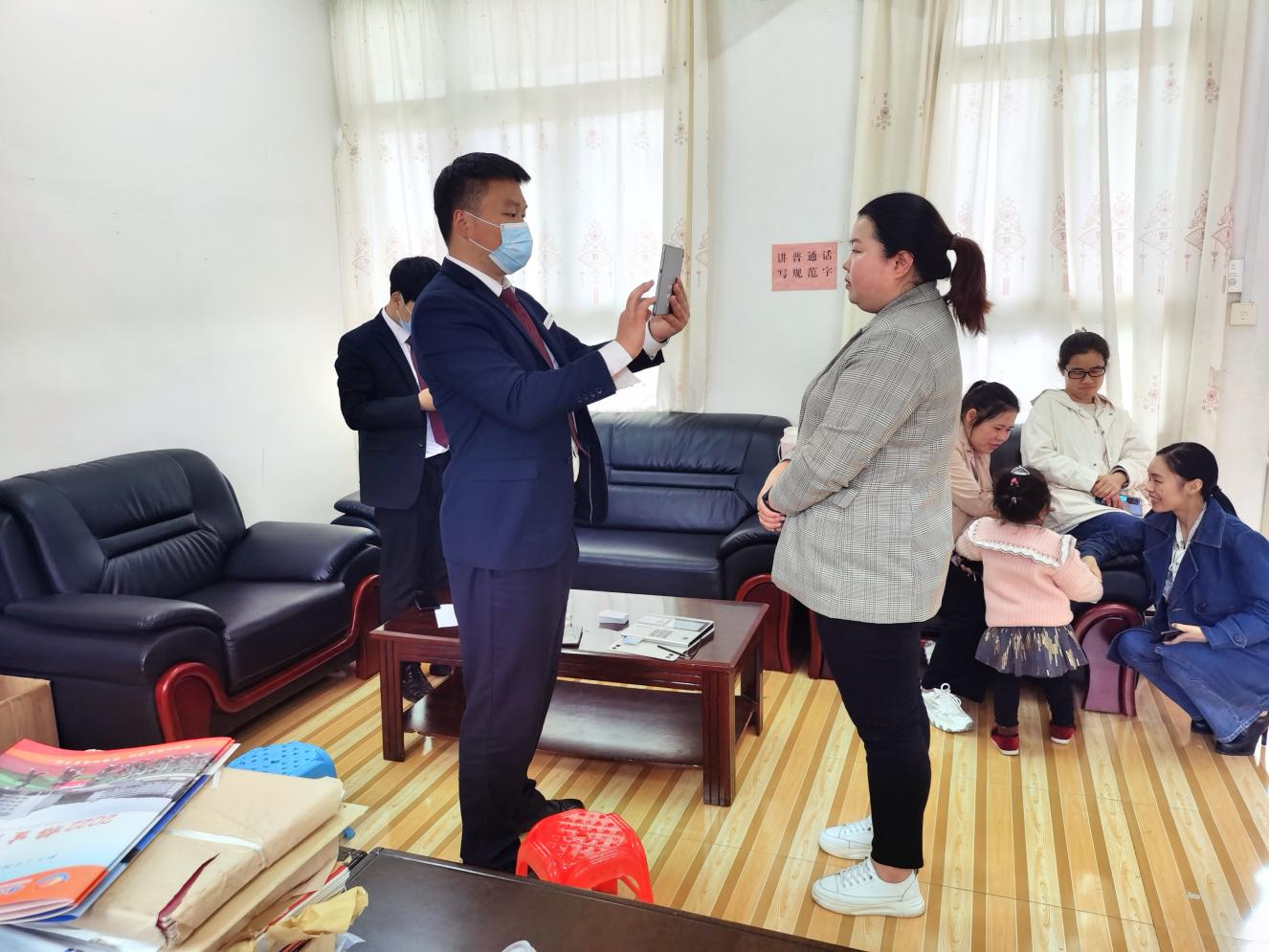 由于很多老师平时都要备课、上课、课后批改作业,实在抽不出时间到营业厅办理社保卡,而办理社保卡开卡需要采集信息、设备制卡、社保卡激活三个步骤才能完成,都坪支行现在还没有移动制卡机,只能在营业大厅进行制卡。在不耽误老师们上课的情况下,都坪支行行长杨军做了统一安排,采取“2+2+1”模式,即利用老师们课堂休息十分钟快速办理社保卡,课间十分钟期间由两名工作人员在学校用移动设备现场采集老师信息传输以便后续激活;老师们课堂上课期间,另外两名工作人员在营业厅利用采集传送过来的社保卡信息进行审核和制卡;再安排一个工作人员机动作业,在学校和都坪支行营业厅来回运送制好的社保卡,通过五个人相互协作接力,解决都坪中学教职工办卡难题。经过一个上午的连续奋战,都坪支行为都坪中学15个教职工采集了制卡信息,成功制卡15张,激活15张卡。