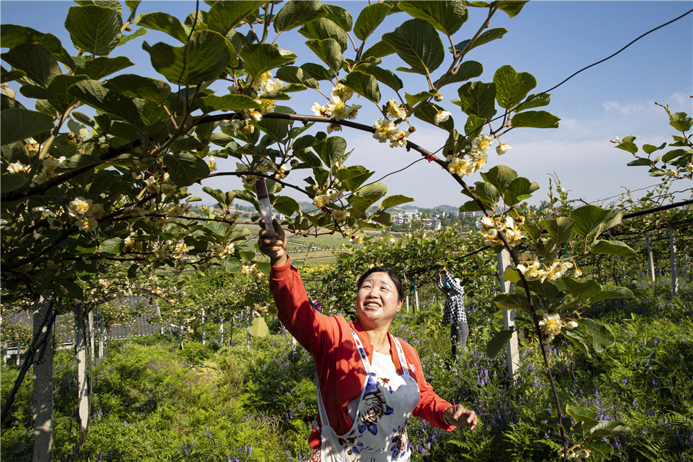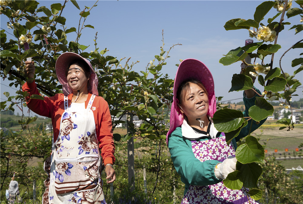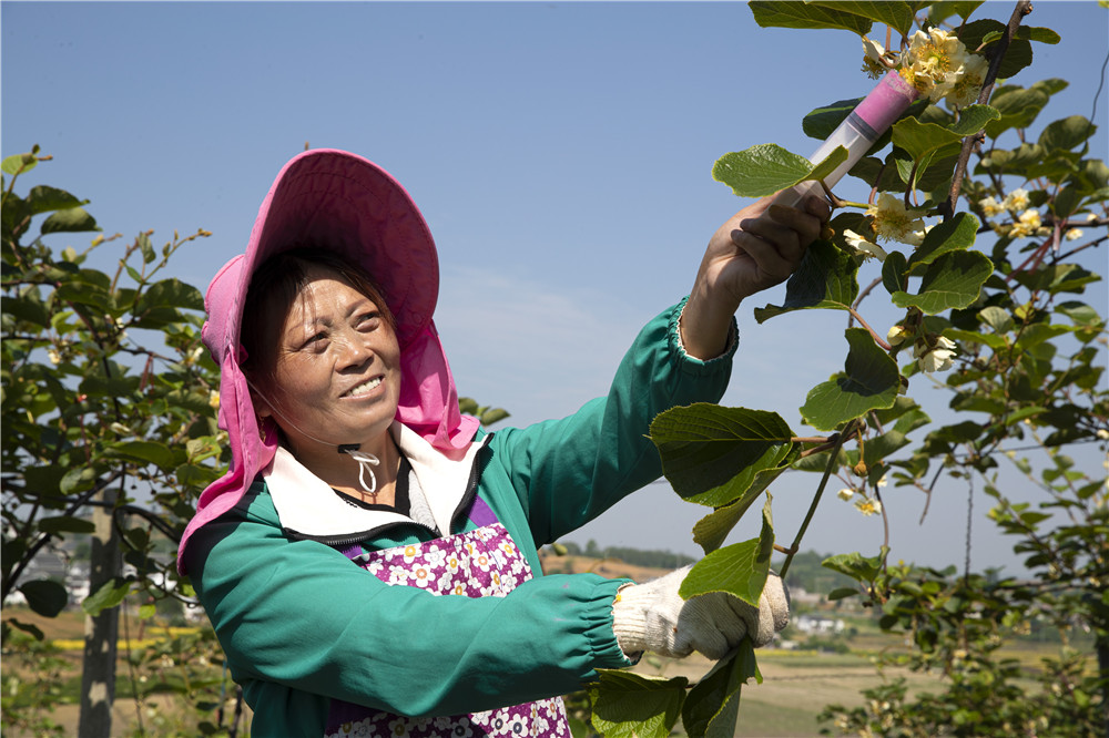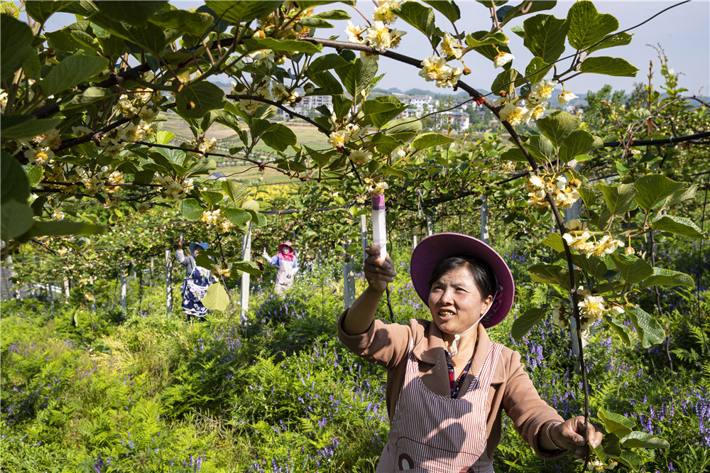 立夏,贵州省黔西市林泉镇海子社区生态农业园,村民抢抓晴好天气为猕猴桃人工授粉。