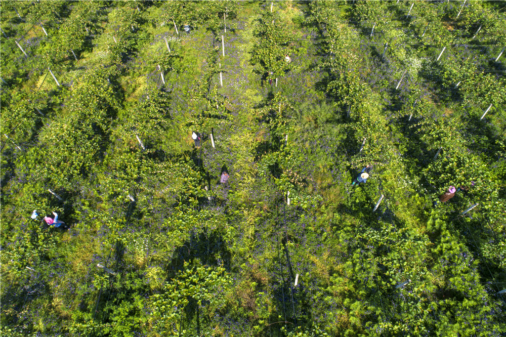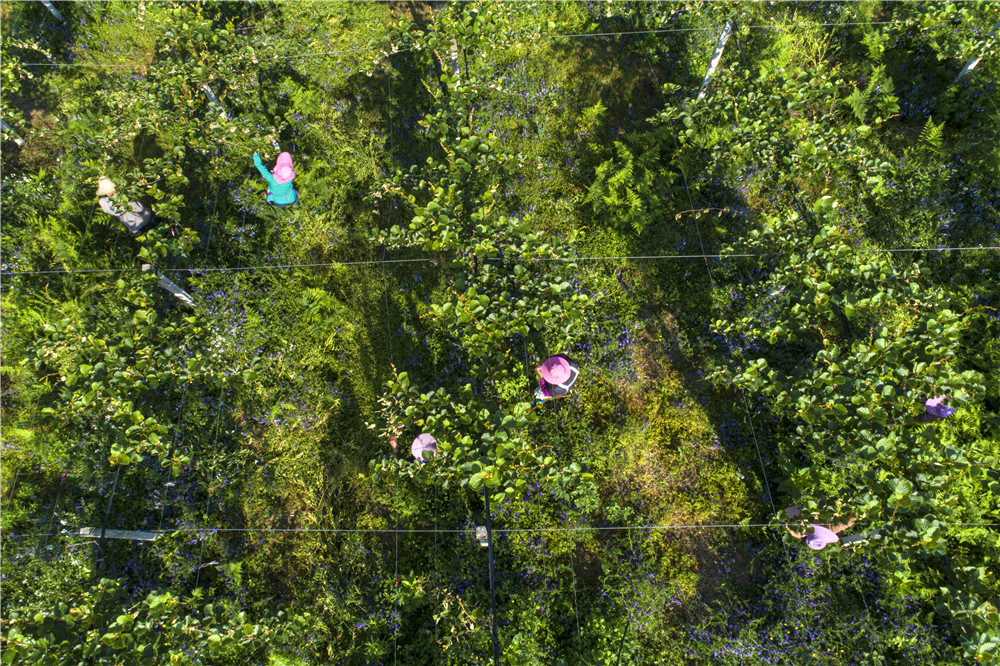 2022年5月5日,贵州省黔西市林泉镇海子社区生态农业园,村民为猕猴桃人工授粉(无人机照片)。