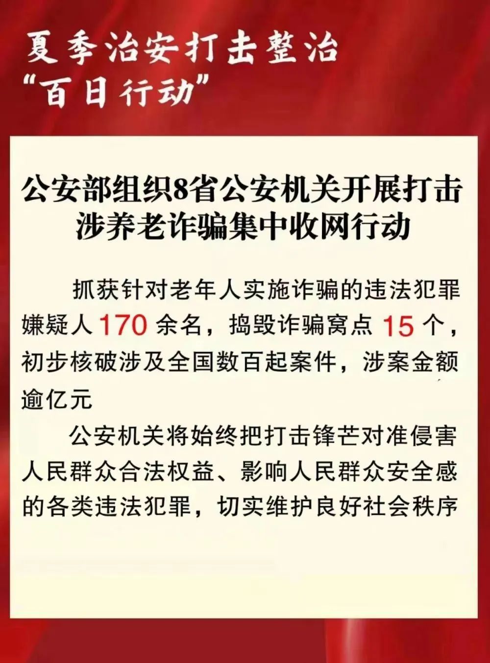 记者7月28日从公安部了解到,为深入推进夏季治安打击整治“百日行动”,公安部近日组织指挥湖北、四川、河北、湖南、海南、云南、陕西、江西8省公安机关协同作战,对2个针对老年人实施诈骗的违法犯罪团伙开展集中收网行动,成功捣毁诈骗窝点15个,抓获违法犯罪嫌疑人170余名,初步核破涉及全国数百起案件,涉案金额逾亿元。