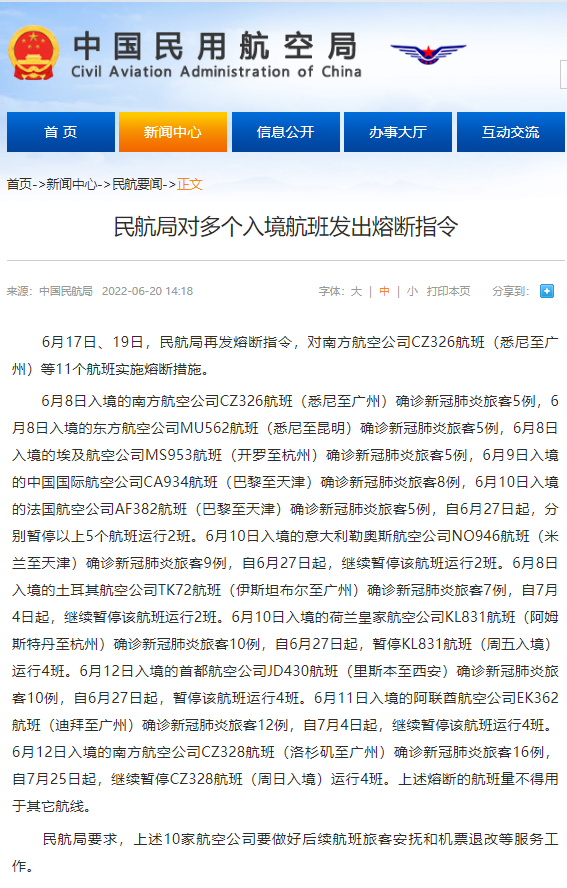 6月17日、19日,民航局再发熔断指令,对南方航空公司CZ326航班(悉尼至广州)等11个航班实施熔断措施。