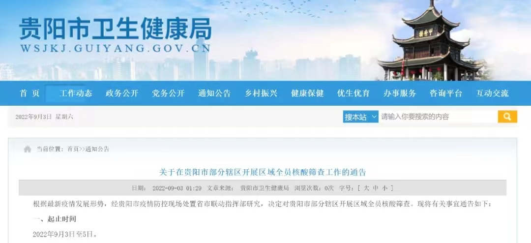 根据贵阳市疫情防控现场处置省市联动指挥部发布的《关于在贵阳市部分辖区开展区域全员核酸筛查工作的通告》要求,自2022年9月3日6时起,市民乘客搭乘地铁须凭24小时核酸检测阴性证明进站乘车。