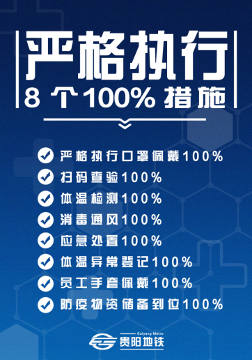 贵阳地铁温馨提示:齐心抗疫,共克时艰,为保障您和他人的安全,各位乘客进站时请主动扫场所码,乘坐地铁请坚持全程佩戴好口罩,候车、购票请站于一米线外保持间隔距离,支持倡导“一应黔行”APP无接触式购票乘车,如需口罩请至车站客服中心免费领取,若需帮助可及时联系车站工作人员或拨打贵阳地铁服务热线0851—87166669,我们将竭诚为您服务。
