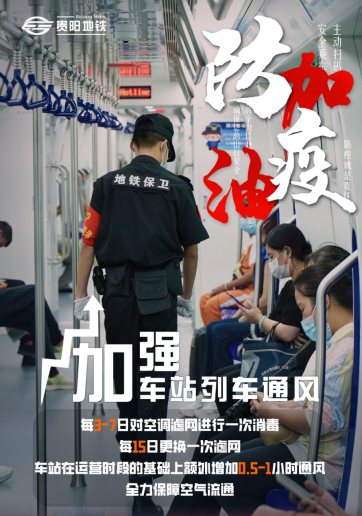 为保持车站车厢内部换气安全,根据疫情情况每3~7日对空调滤网进行一次消毒、每15日更换一次滤网;因车站及列车内人员较为集中,为保障车站及车厢内部空气的流通,贵阳地铁在运营时段的基础上额外增加0.5~1小时通风、列车根据外部环境温度采用最大通风量不间断通风或正常通风量不断通风。