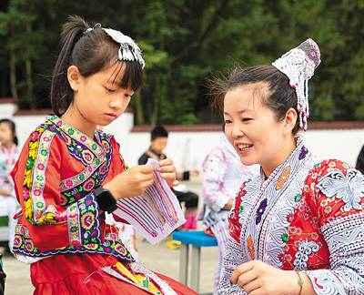 近年来,贵州省黔西市新仁苗族乡折溪小学依托苗族文化资源优势,积极推动苗绣非遗进校园,邀请当地苗绣蜡染传承人定期和不定期到校指导,让学生体验苗绣技艺,感受非遗魅力,更好地传承和弘扬民族传统文化。