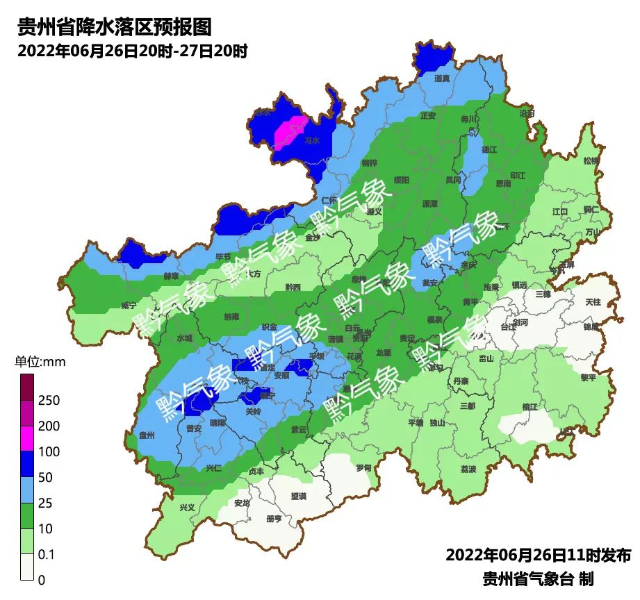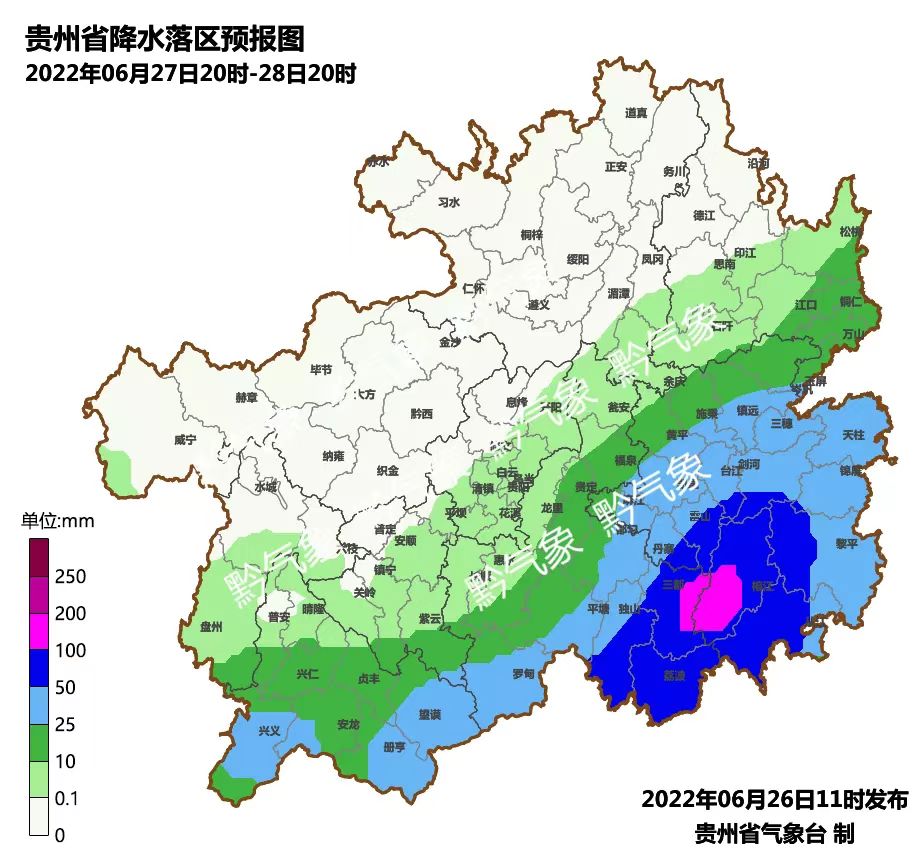 周一(27日),省的北部地区阴天有阵雨或雷雨,其余地区多云转阴天有阵雨或雷雨,其中六盘水市东部、安顺市、黔西南州北部、贵阳市南部、黔南州、黔东南州局部有大雨到暴雨,部分乡镇有大暴雨;
