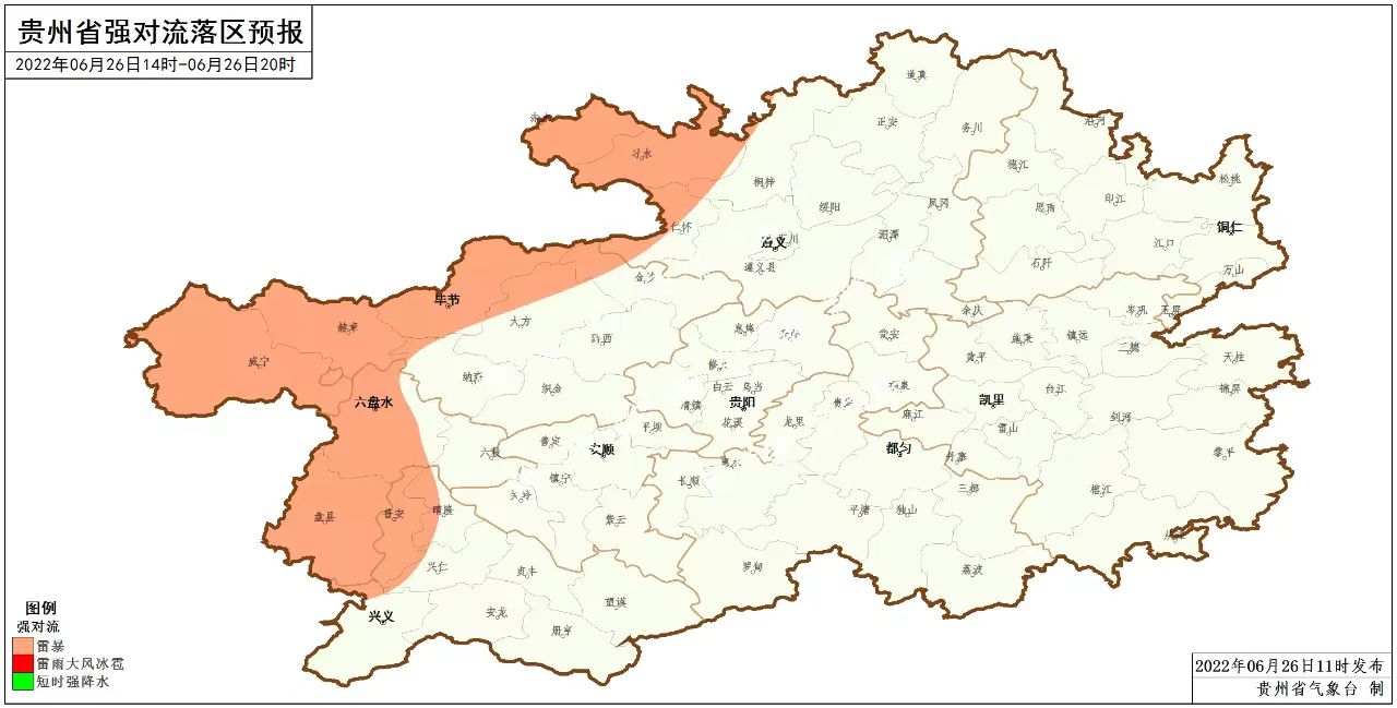具体预报如下:今天夜间(26日夜间),今天夜间,遵义市西部北部、毕节市北部有大雨到暴雨,部分乡镇有大暴雨,其余地区多云有分散阵雨;