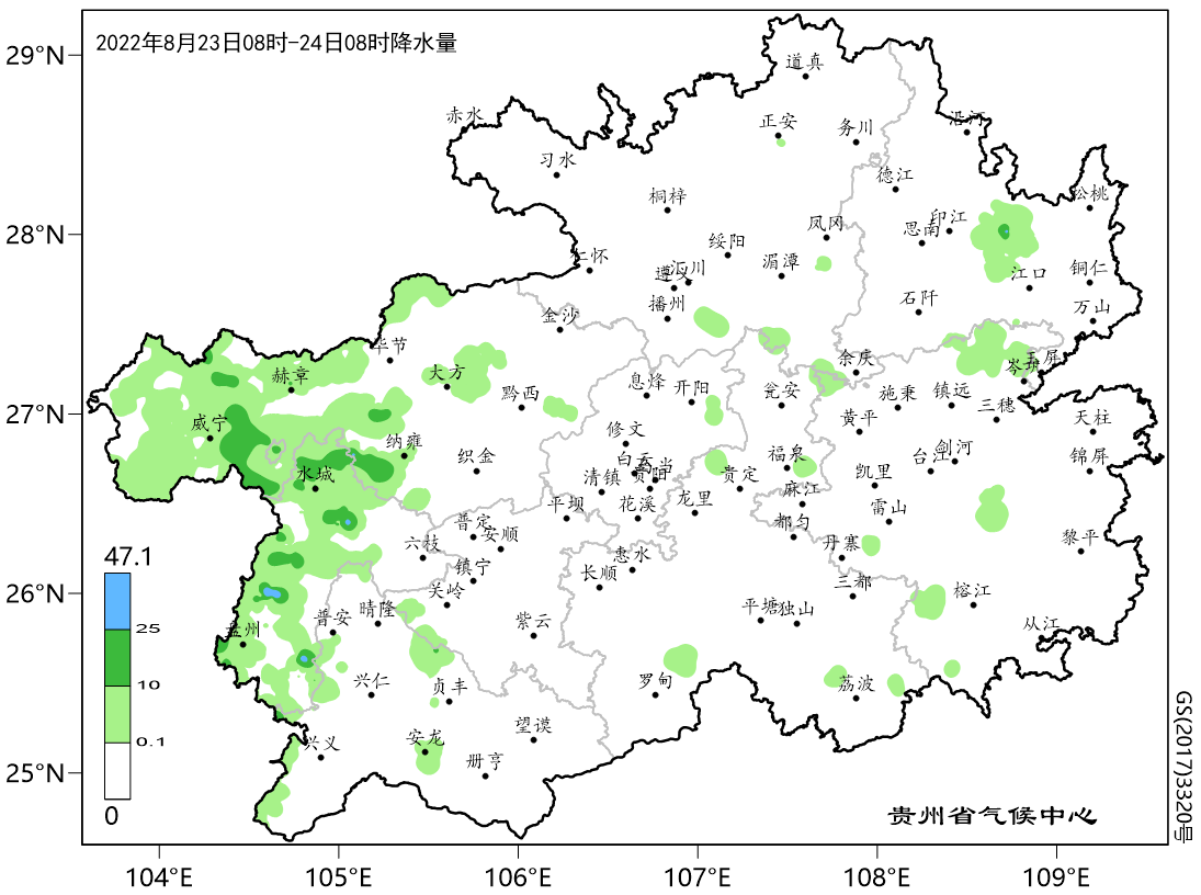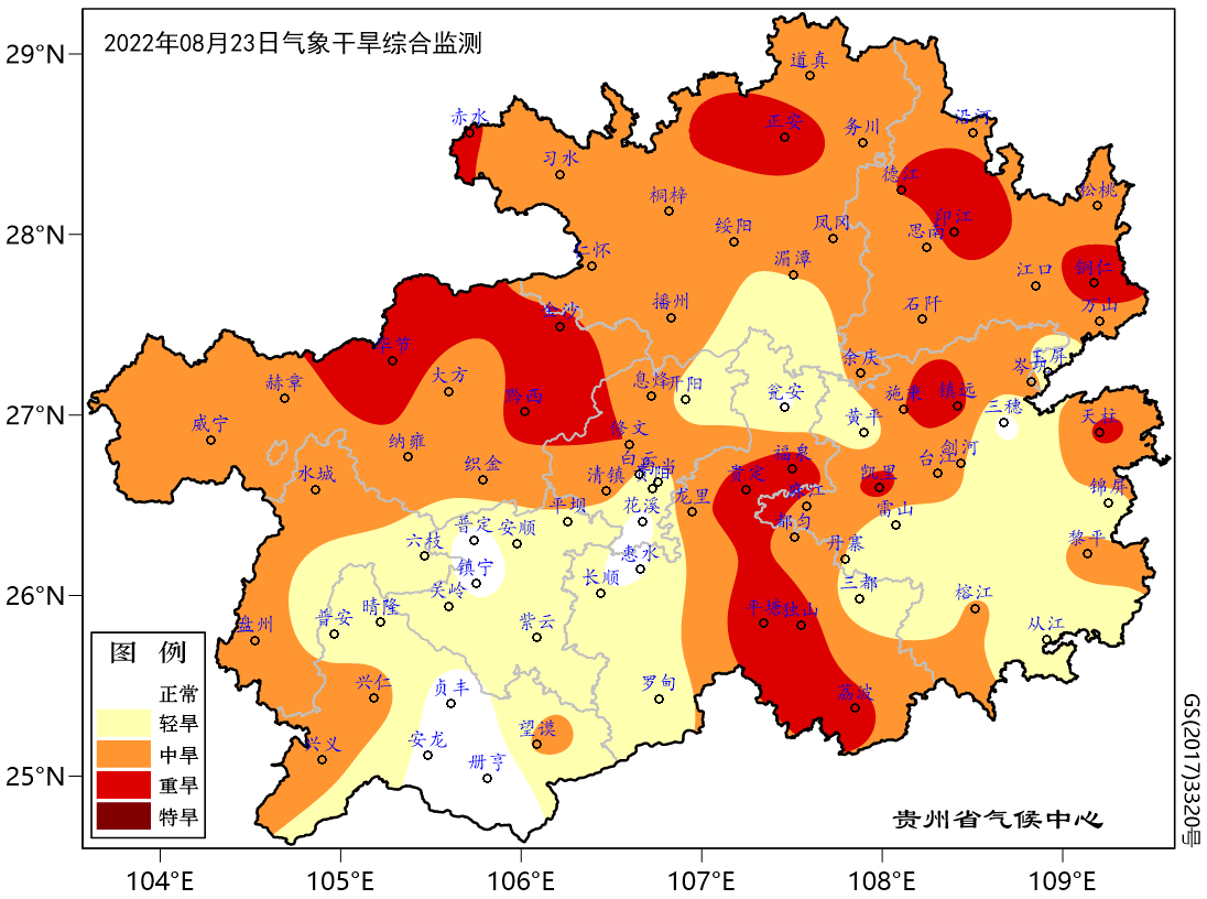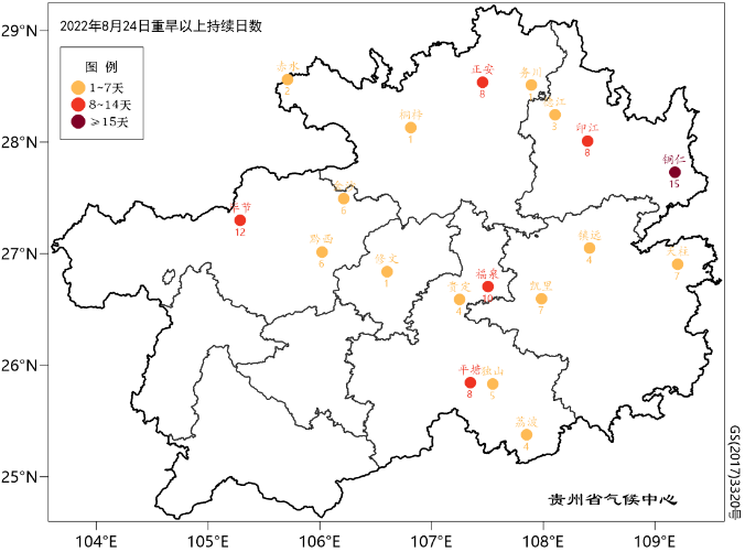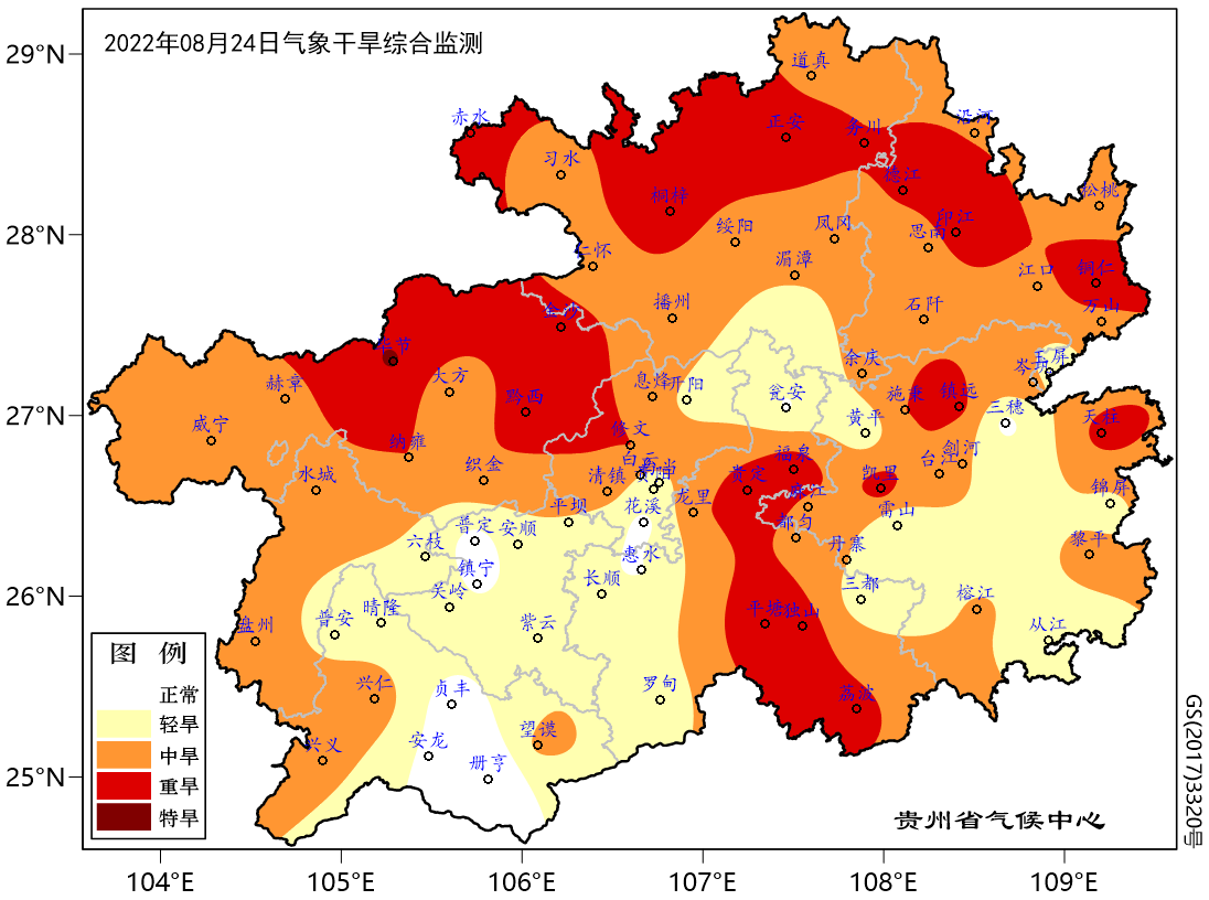 据省气象台消息显示,2022年8月24日气象干旱综合监测,全省出现特旱1站(七星关),重旱18站(黔西、金沙、赤水、桐梓、正安、务川、德江、印江、碧江、天柱、镇远、凯里、福泉、贵定、平塘、独山、荔波、修文),其中桐梓、务川、修文为新增,中旱38站,轻旱17站;中旱以上区域主要分布在毕节市、遵义市、铜仁市、黔东南州北部及局地、黔南州中东部、黔西南州西部和东部、六盘水市西部等地。8月23日08时-24日08时,省西北部及局地有小雨或中雨,对当地气象干旱略有缓解,但气象干旱等级维持不变,其余地区无明显降水,省东北部较23日有所发展。目前,七星关、正安、印江、碧江、福泉、平塘6站重旱以上持续日数超过一周,其中碧江持续时间最长达15天。