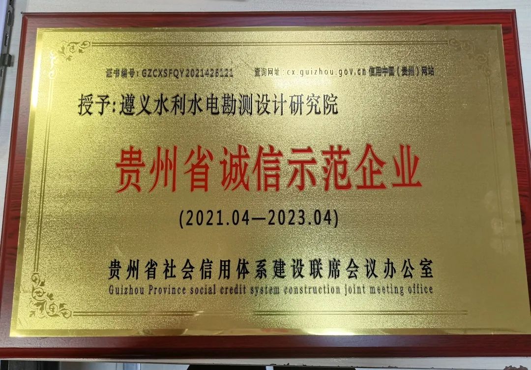 翻开企业的“诚信”成绩单,一个个亮眼成果呈现在记者眼前:2021年获评第三届贵州省诚信示范企业,连续六年获得省级“守合同·重信用单位”称号,在全国水利建设市场主体信用评价中取得施工“AAA”和勘察、设计“AA”级信用评价……