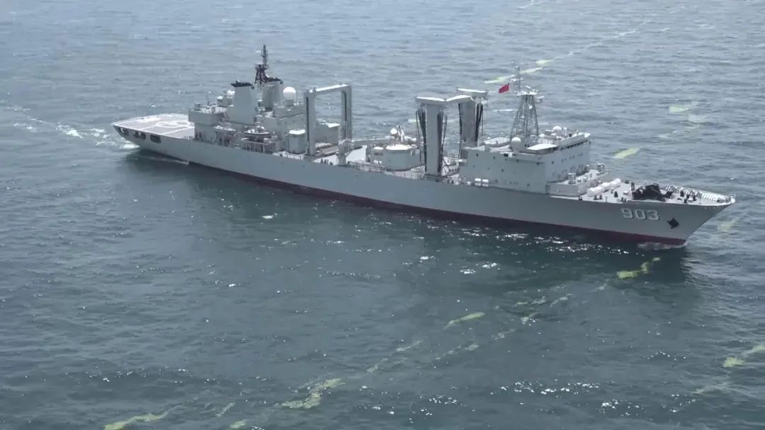 可可西里湖舰,舷号903,是我国自行设计建造的新型远洋综合补给舰。该舰2019年3月入列,满载排水量20000余吨,具有两舷三向四站同时补给能力,可通过横向、纵向、垂直和并靠等多种方式对舰艇编队实施油料、淡水、食品、弹药等物资补给作业。