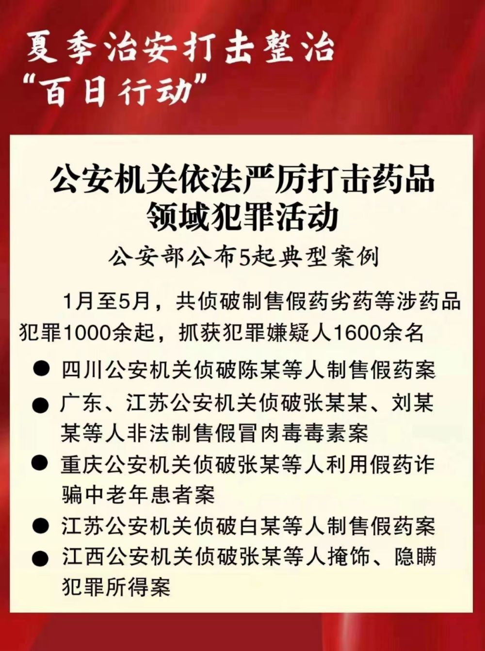 记者从公安部获悉,全国公安机关依法严厉打击制售假药劣药等药品领域犯罪活动,今年1月至5月共侦破涉药品犯罪案件1000余起,抓获犯罪嫌疑人1600余名。公安部7月11日公布5起典型案例。
