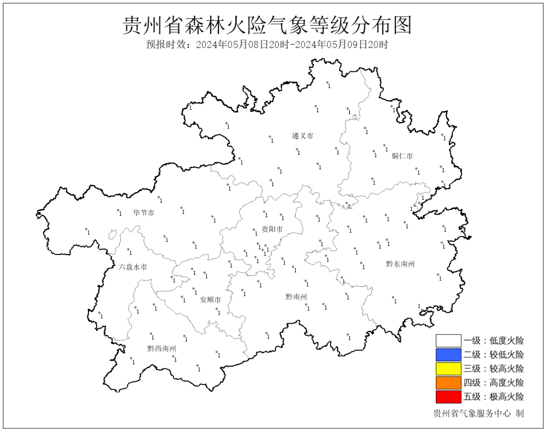 2024年5月8日20时-5月9日20时:全省森林火险气象等级低,为1级。