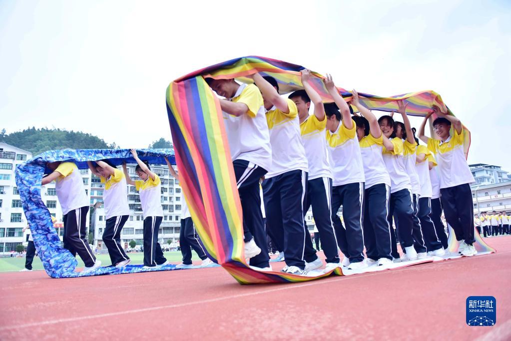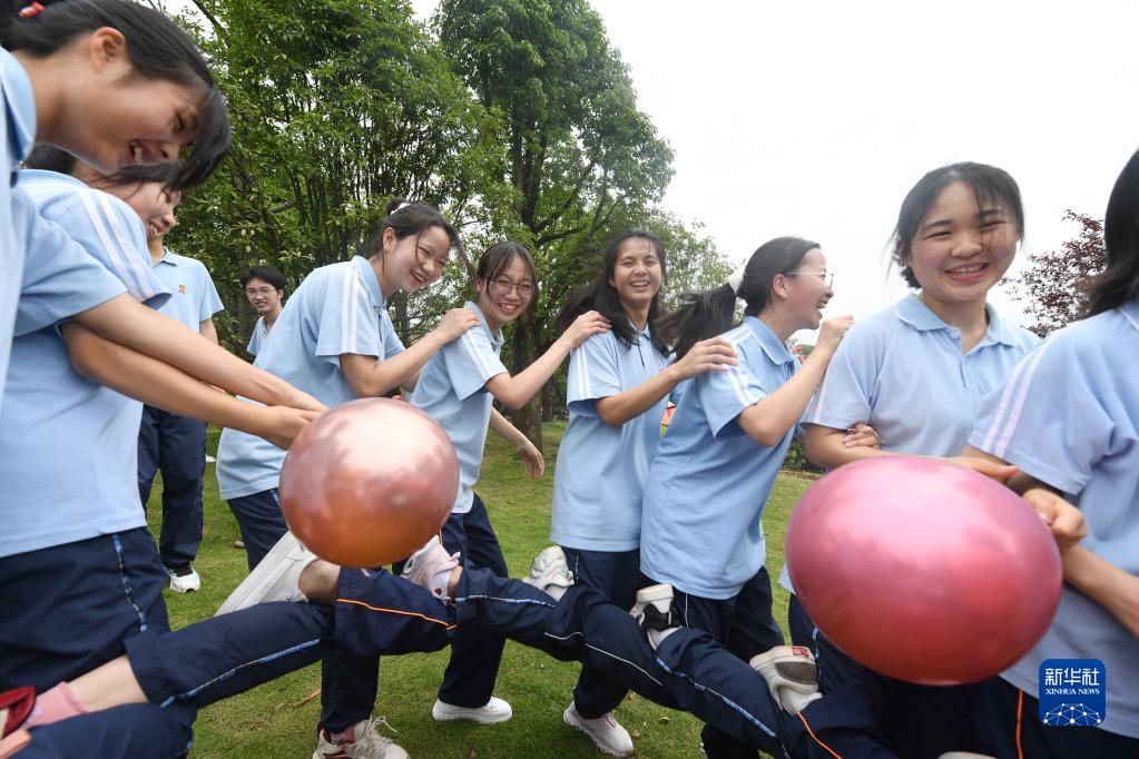 5月19日,在贵州省从江县第一民族中学,高三学生参加风火轮大比拼趣味游戏。新华社发(石宏辉 摄)