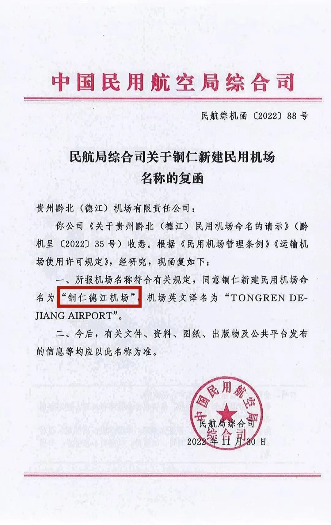 《民航局综合司关于铜仁新建民用机场名称的复函》