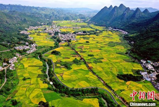 万峰林景区是中国首批“全国农业旅游示范点”,属于中国西南喀斯特地貌。登高远眺,青绿色的秀峰似林,金黄的稻田、碧绿的河流与古朴的村寨相映成趣,宛如一幅山水画卷。