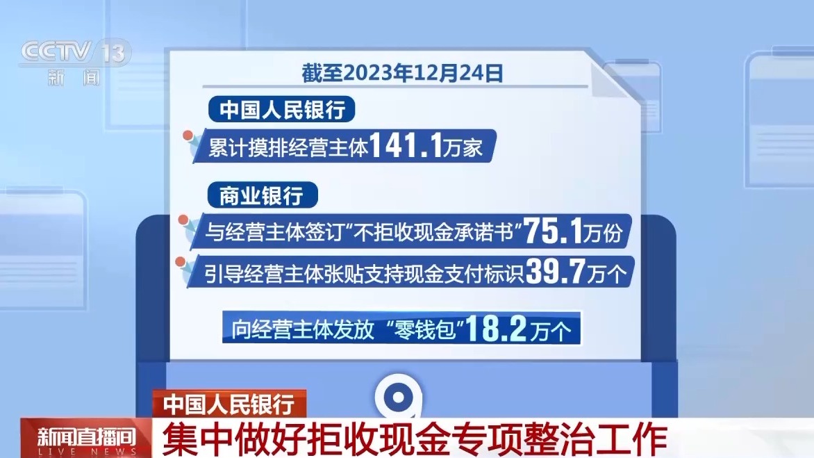 中国人民银行表示,截至2023年12月24日,累计摸排经营主体141.1万家。商业银行与经营主体签订“不拒收现金承诺书”75.1万份,引导经营主体张贴支持现金支付标识39.7万个,向经营主体发放“零钱包”18.2万个。对零钱备付不足的经营主体进行提示,并按需求开展上门收款、上门配款等多样化、个性化现金服务,不断提升经营主体接受现金的意愿。