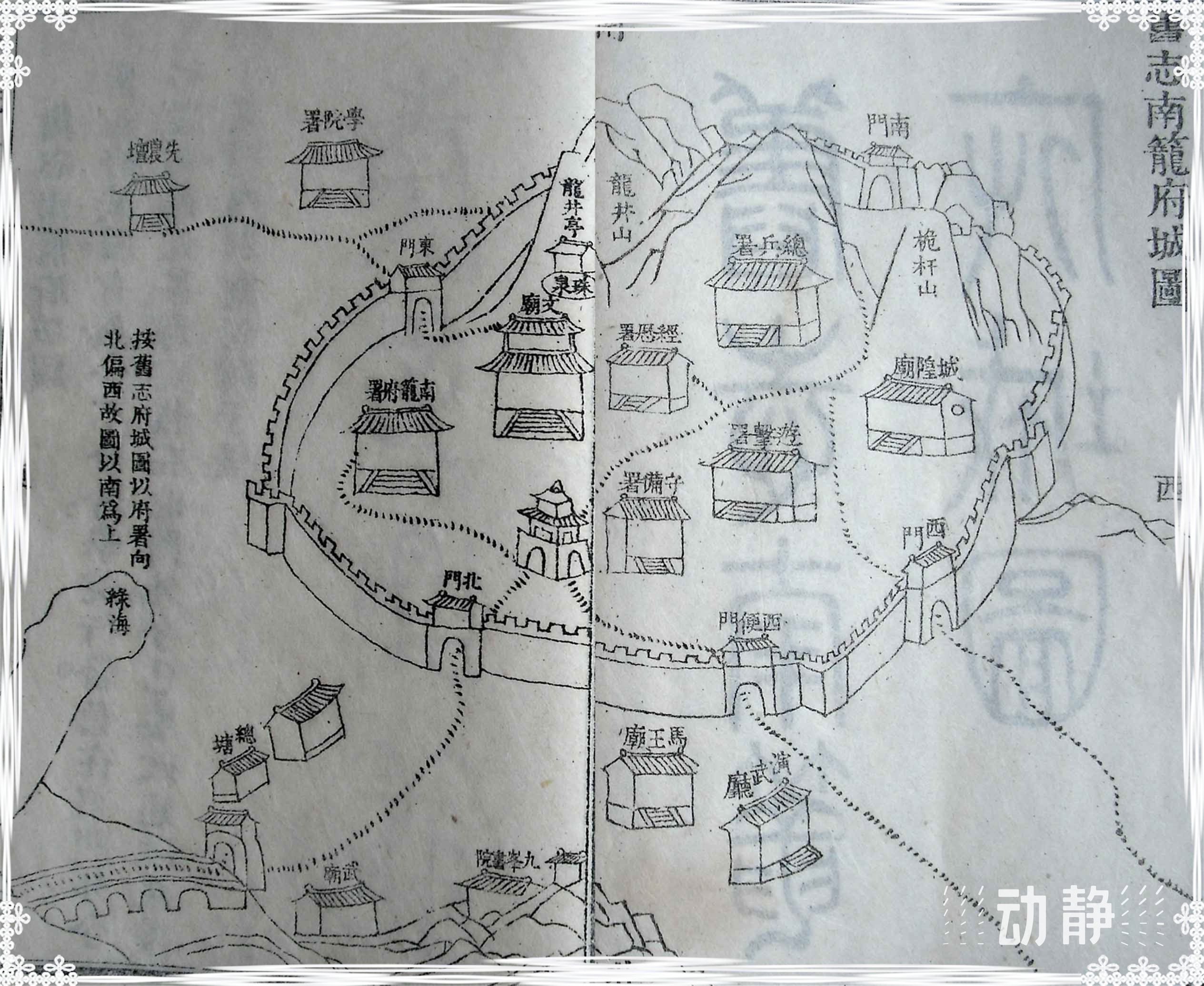 安龙城垣共修筑有五个城门。东门聚奎,奎星主文运,大概是预示安龙文运兴旺。西门怀远,寓意朝廷安抚境内之民,怀柔外藩诸部。南门从风,比喻老百姓要及时响应朝廷号召和顺从,古有“从风而服”的说法。北门拱宸,取自《论语》为政篇,“为政以德,譬如北辰,居其所,而众星拱之”,和地方文教息息相关。每个城门上都修筑有“杰阁凌空”之城楼,“檐牙高啄”,即城楼的屋檐飞翘,像鸟嘴一样华丽。整个城垣的地势为北低南高,南部有龙井山和桅杆山两座大山,城垣修在山腰之上,和今天安龙老城的地形相差无几。第五道城门,位于西门与北门之间,称为西便门。一百年之后,南笼府早已在嘉庆二年(1797)改为兴义府。道光二十一年(1841),张锳第一次任兴义知府时期,重修了西门、南门和城楼。道光二十八年(1848),张锳第二次任兴义知府时期,拓修西便门,额题“凌云”,寓意安龙之文教呈壮志凌云之势,一飞冲天。咸丰四年(1854),张锳在兴义府任上的最后一年,还在继续加固城墙。同时模仿李白著名的《登锦城散花楼》一诗,对安龙焕然一新的府城亦有诗云:“日照府城楼,朝霞从凤楼。金窗夹绣户,珠箔悬琼钩。飞梯绿云中,极目喜心头。暮雨向两海,溪水绕双流。今来一登望,如上九天游。”