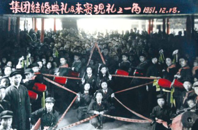 浙江省湖州市德清县委党史研究室收藏着一张特殊的照片。照片为某集团结婚典礼及来宾参观之一角,拍摄时间为1951年12月18日。照片中,参加集体婚礼的姑娘们用红丝带围成一个五角星,很有创意也很有趣味。照片反映了新中国成立之后、《婚姻法》实施之初,德清青年冲破包办婚姻束缚,自由恋爱、婚姻自主、婚礼简化的风气。