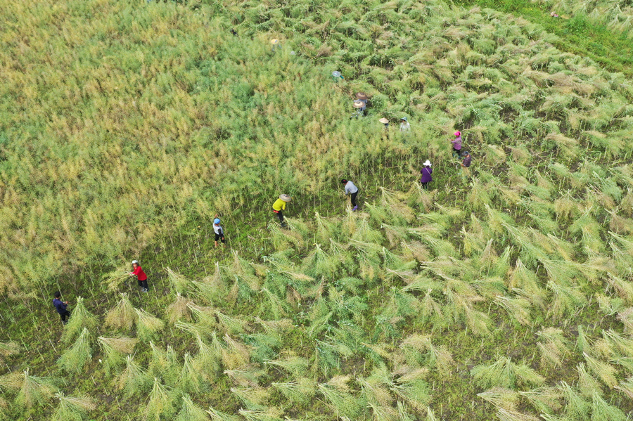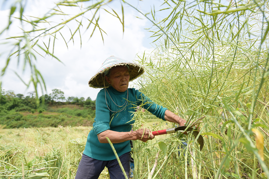时下,正值油菜籽采收旺季。在贵州省岑巩县思旸镇盘街村,村合作社种植的200亩油菜已相继进入成熟收割期。连片的油菜田里,成熟的油菜茎杆粗壮、结籽饱满,村民们将刚收割的一株株油菜整齐摆放在田地里,利用晴好天气进行晒干,争取早日颗粒归仓。