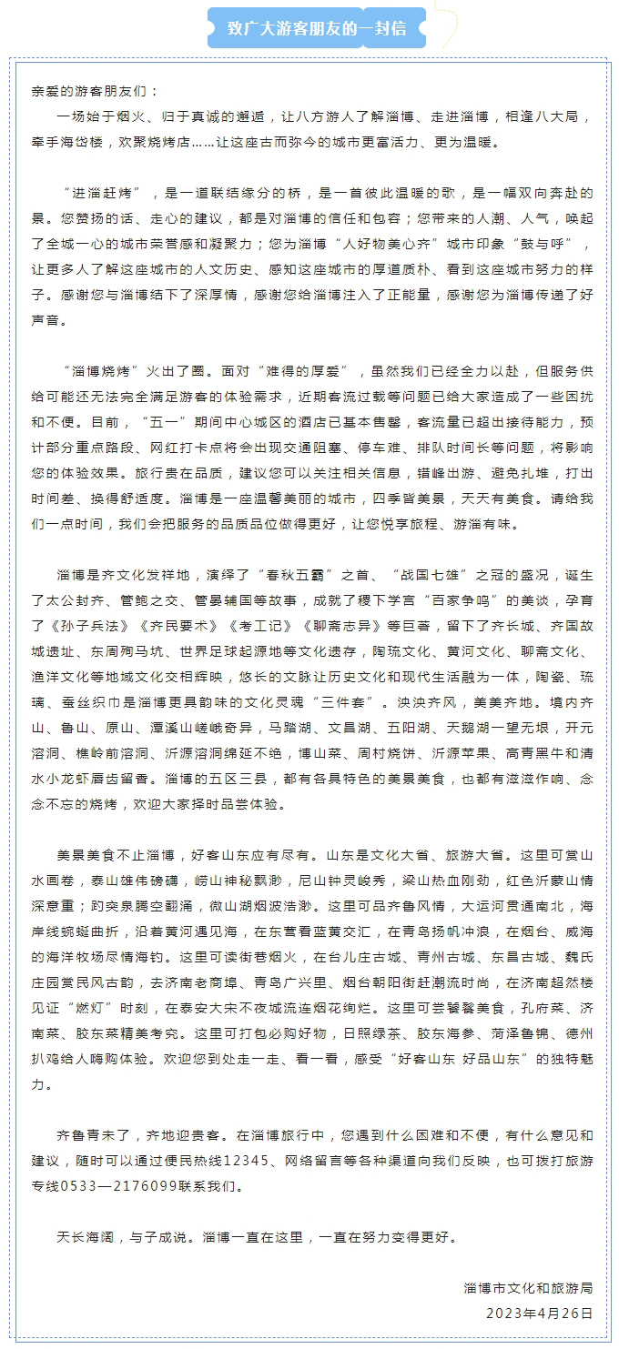 “文旅淄博”微信公号今日发布致广大游客朋友的一封信: