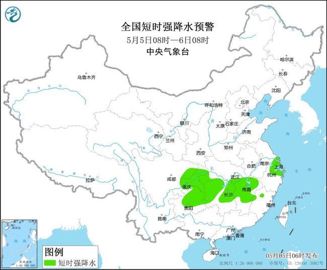 预计5月5日08时至6日08时,湖北西部、湖南西部、江西西北部、四川盆地东北部、重庆西部、贵州中东部和北部等地的部分地区将有8~10级雷暴大风或冰雹天气;江苏南部、上海、湖北西部和南部、湖南、江西、浙江北部、福建西北部、四川盆地东北部、重庆、贵州中东部和北部等地的部分地区将有短时强降水天气,小时雨量20~40毫米,局地可达50毫米以上。