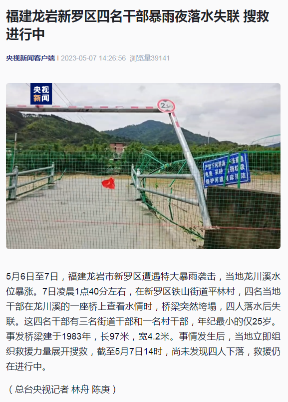 7日凌晨1点40分左右,在新罗区铁山街道平林村,四名当地干部在龙川溪的一座桥上查看水情时,桥梁突然垮塌,四人落水后失联。这四名干部有三名街道干部和一名村干部,年纪最小的仅25岁。