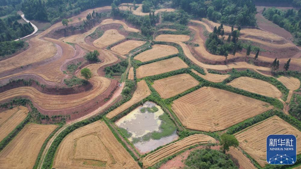近日,重庆市潼南区的山地小麦进入成熟收获期,层层叠叠的梯田上麦浪翻黄,夏粮丰收。新华社发(黎昭 摄)