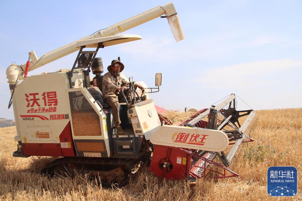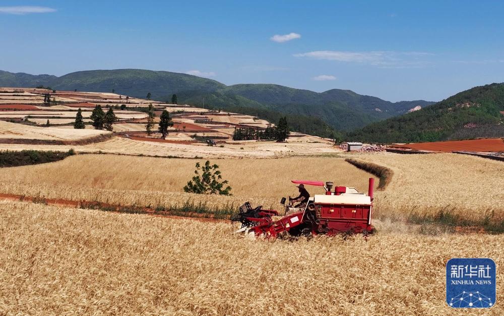 在云南省红河州石屏县哨冲镇,农民驾驶农机收割小麦。新华社发(胡文甜 摄)