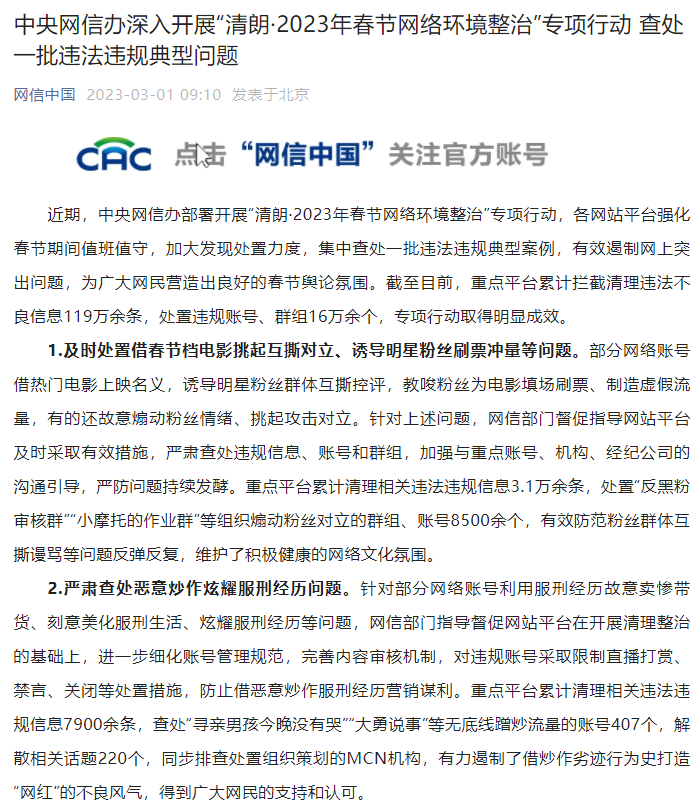 原标题:中央网信办深入开展“清朗·2023年春节网络环境整治”专项行动 查处一批违法违规典型问题