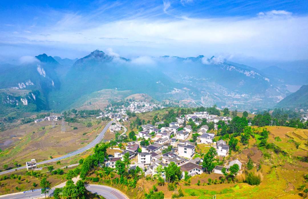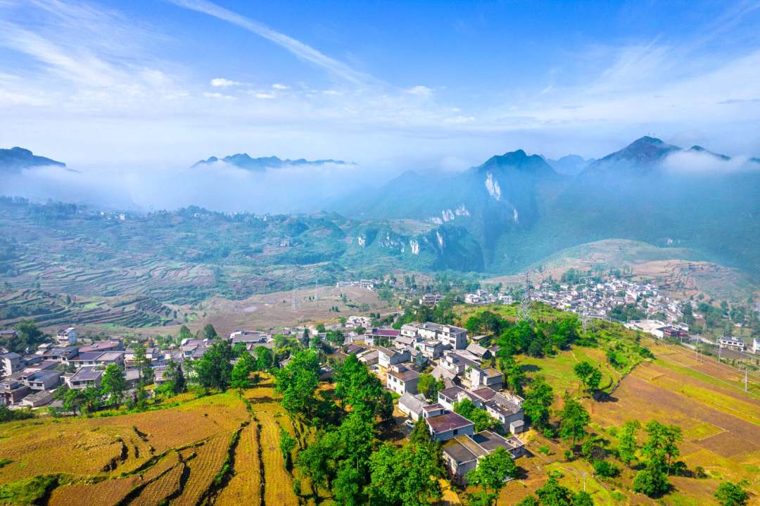 5月5日,地处乌蒙山腹地的贵州省黔西市五里布依族苗族乡中心村晨雾缭绕,民居、山峦、公路交相辉映,美如画卷。( 史开心 摄)