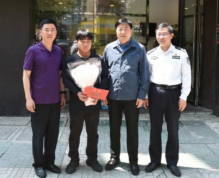 5月17日上午,南京市见义勇为基金会理事长孙建友一行为杨帆颁发了见义勇为专项奖励金并送上鲜花。