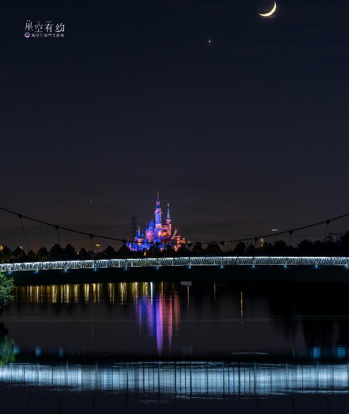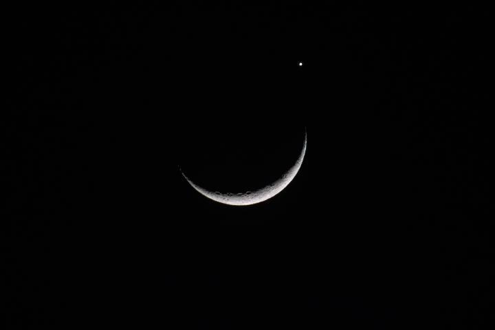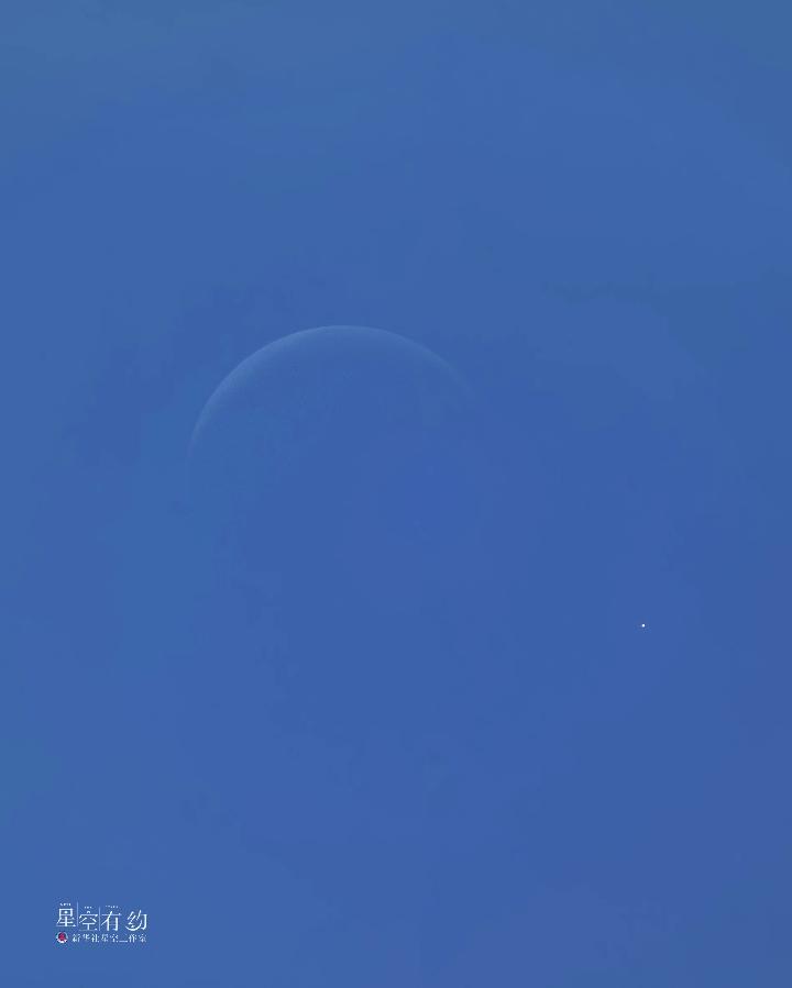 由于金星总在太阳附近徘徊,所以月球与之相伴时,月相要么是农历月初的蛾眉月,窄窄的;要么是农历月末的残月,细细的。
