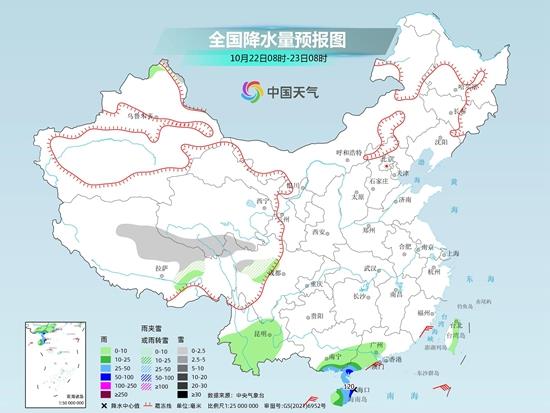 具体来看,今天,内蒙古东北部、黑龙江大部、新疆北疆北部、西藏东部、川西高原北部等地部分地区有小雪或雨夹雪。广西东南部、广东西南部和海南岛等地部分地区有中到大雨,其中,广东西南部、海南岛东部等地部分地区有暴雨。