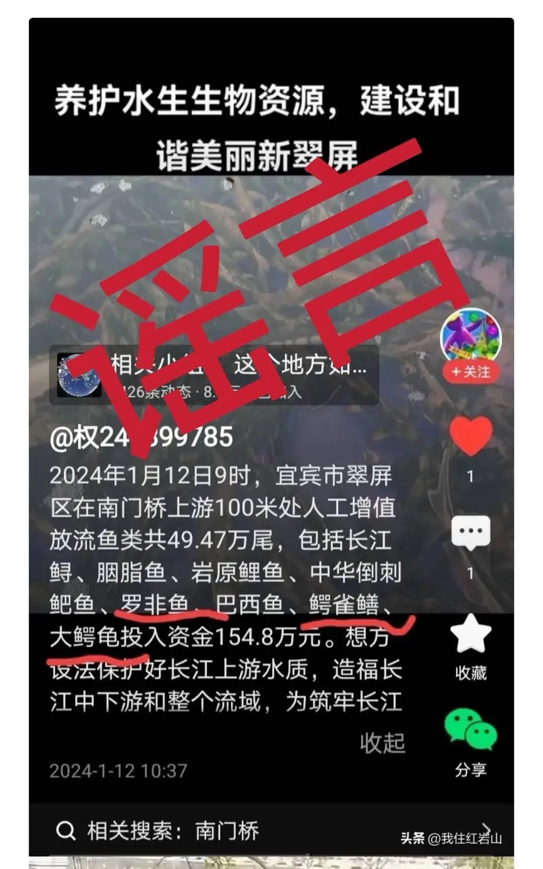 “这是谣言。活动中投放的鱼类为长江鲟等濒危物种,通过放流成体、亚成体、苗种等不同种群,可以为种群恢复和自然繁殖起到良好促进作用。”四川省宜宾市翠屏区农业农村局水产渔业站站长刘晓欢告诉记者,该信息发布的图片截图和视频内容为1月12日翠屏区人工增殖放流活动的画面。他说,此次活动共增殖放流鱼类共49.47万尾,其中包括长江鲟0.27万尾、胭脂鱼7.8万尾、岩原鲤10.8万尾、长吻鮠1.8万尾、中华倒刺鲃7万尾、鳙鱼20万尾等,没有该信息中提到的鳄雀鳝、罗非鱼、大鳄龟等水生外来入侵物种。