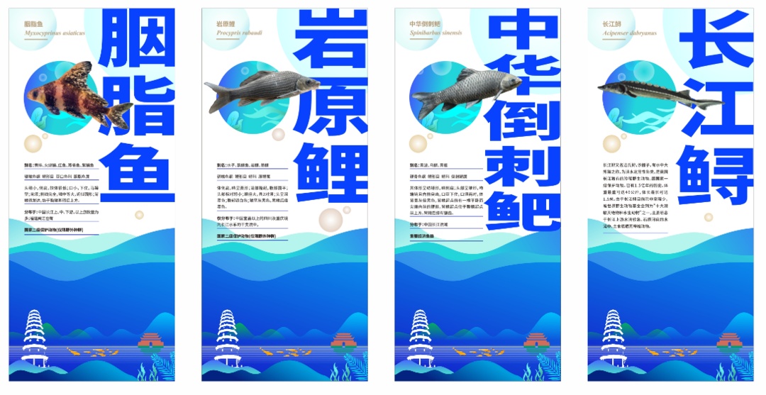 翠屏区人工增殖放流活动现场展示的长江鲟等珍稀鱼类科普图片。
