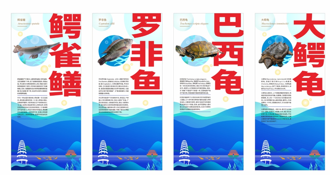 翠屏区人工增殖放流活动现场展示的鳄雀鳝等水生外来入侵物种科普图片。
