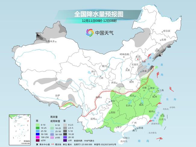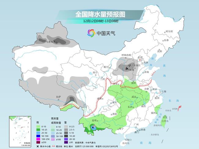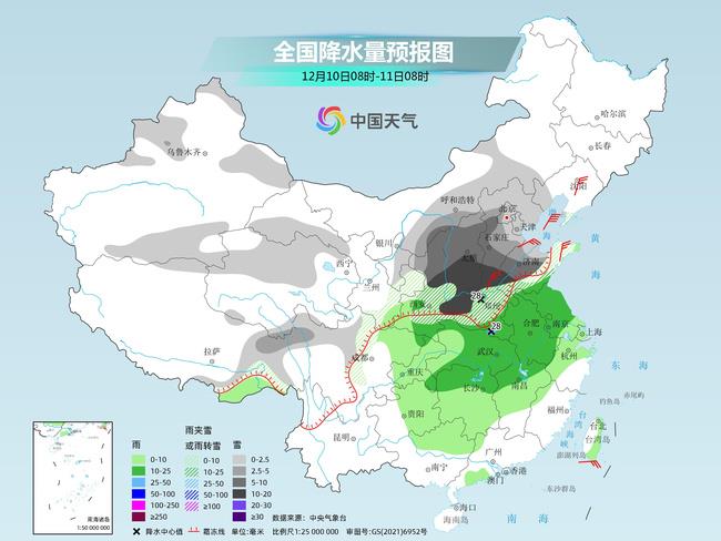 此外,由于冷空气影响频繁,12月10日至11日、13日至15日,中东部地区将接连出现两轮大范围雨雪天气过程。其中今天将是第一轮过程的核心影响时段,西北地区东部、华北、黄淮、内蒙古中东部及新疆沿天山地区、甘肃西部、青海北部、西藏东部等地部分地区有小到中雪或雨夹雪,其中,陕西中北部、山西大部、河北西部和南部、河南北部、山东中西部等地部分地区有大到暴雪。西南地区东部、江淮、江汉、江南大部、华南北部、台湾岛等地部分地区有小到中雨,其中,河南南部等地部分地区有大雨(25~28毫米)。