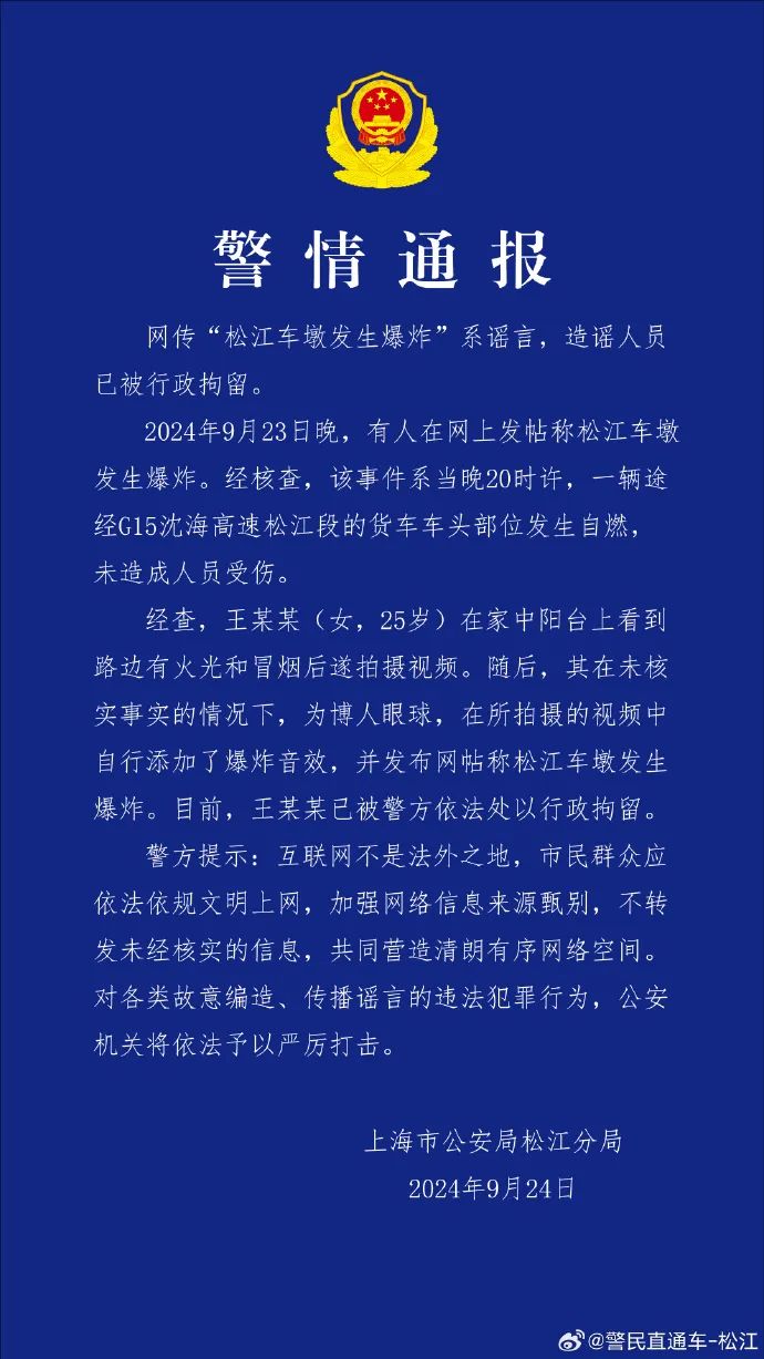 经查,王某某(女,25岁)在家中阳台上看到路边有火光和冒烟后遂拍摄视频。随后,其在未核实事实的情况下,为博人眼球,在所拍摄的视频中自行添加了爆炸音效,并发布网帖称松江车墩发生爆炸。目前,王某某已被警方依法处以行政拘留。