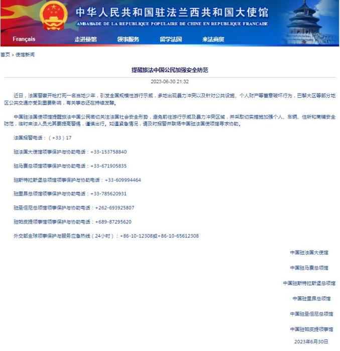 据中国驻法国大使馆当地时间6月30日消息,法国警察开枪射杀少年事件,在法国引发全国规模性游行示威,事态持续发酵,中国驻法国大使馆提醒旅法中国公民加强安全防范。